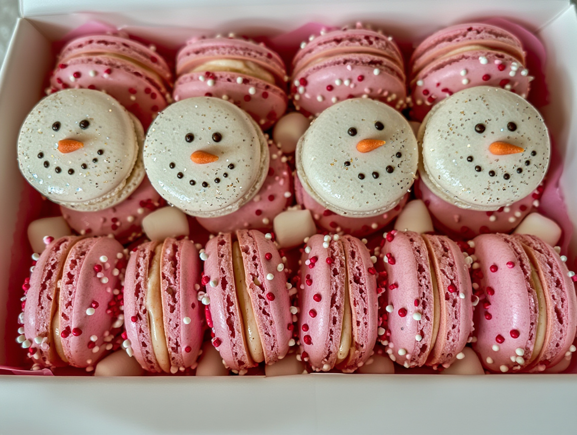 The pink and white color scheme evokes a snowy winter wonderland, while the snowman faces add a whimsical touch that will delight both children and adults. The combination of almond flour, egg whites, and marshmallows creates a delightful texture contrast that's sure to impress. Best of all, these macarons are surprisingly easy to assemble, making them an excellent choice for even novice bakers looking to create professional-looking holiday treats.