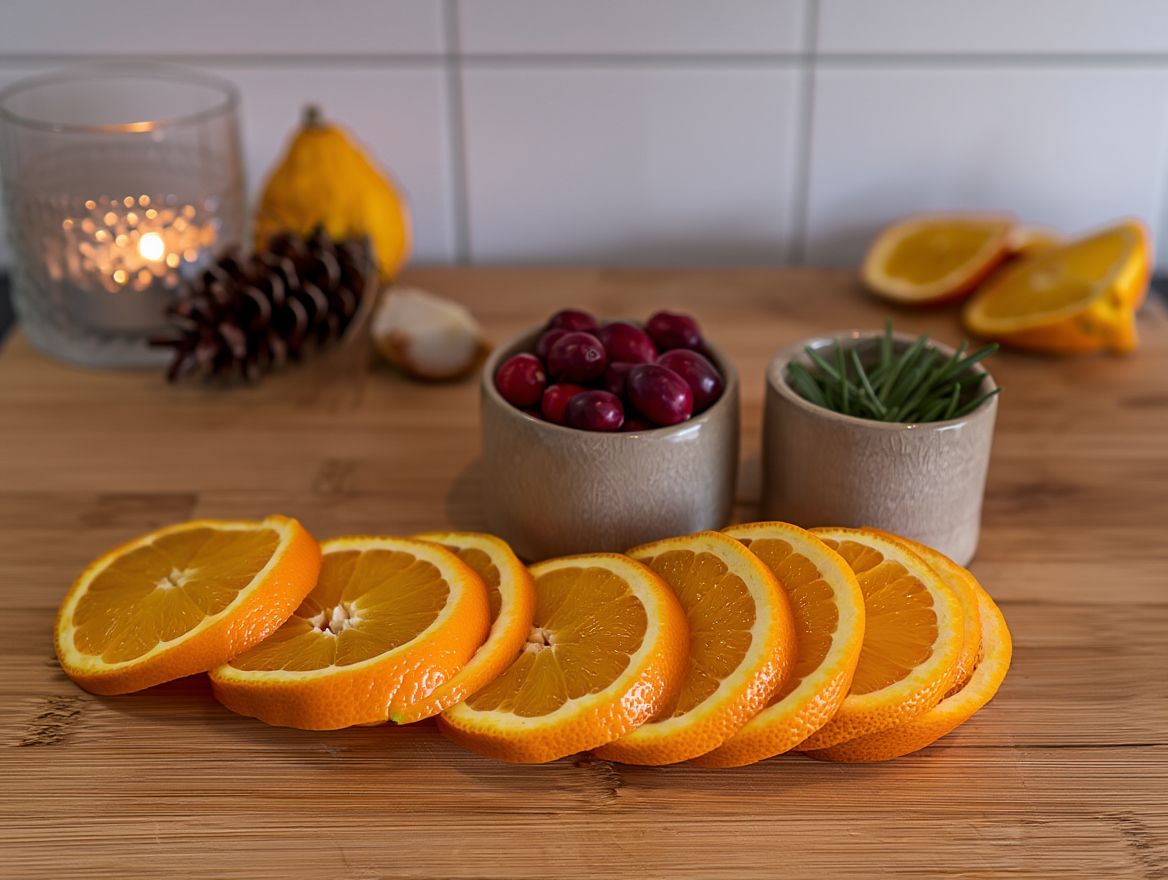 - Top each slice with a fresh mint leaf and a whole orange slice for decoration. Place a pinecone and candle nearby for a festive touch.