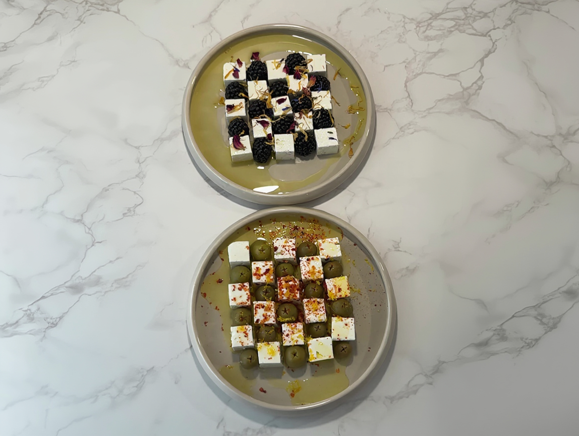 - Crumble the feta into 12 equal cubes using a cheese cutter. Place them on two marble plates for a clean, modern presentation.