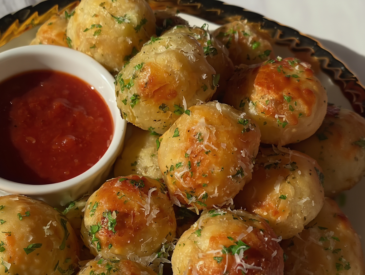 - Once golden and crispy, transfer the puffs to a serving plate. Drizzle with marinara and garnish with extra parsley before serving.