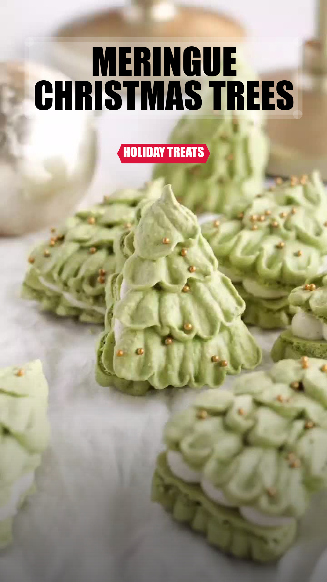 - Once cooled, dust the meringues with powdered sugar and press 2-3 gold dragees onto each tree for decoration. Store them in an airtight container to keep them crisp.